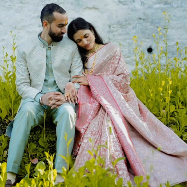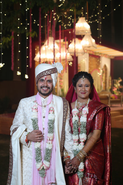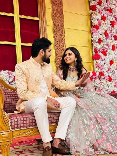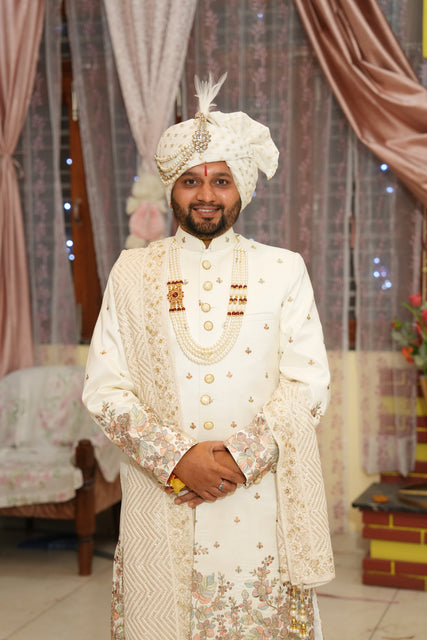 Make a striking impression at any celebration with this elegant emerald green sherwani set, designed for the modern man who appreciates tradition with a stylish twist. The ensemble features a...