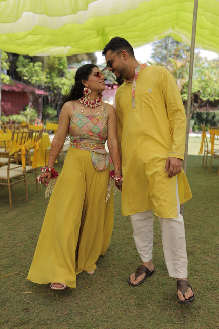 Embrace a refined blend of tradition and artistry with this **ivory kurta** featuring a charming hand-drawn botanical print. Gracefully adorned with delicate palm trees and intricate foliage, the design brings...